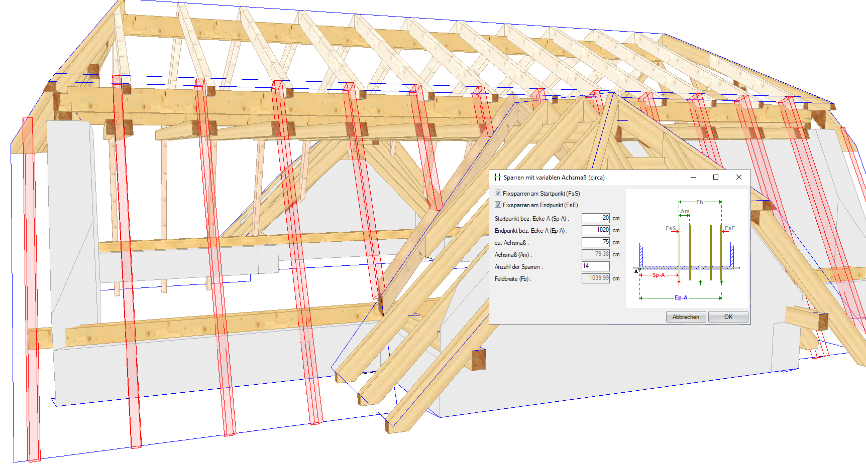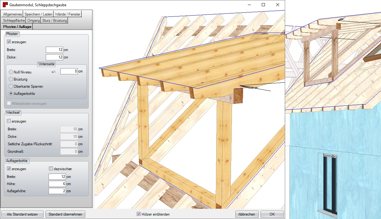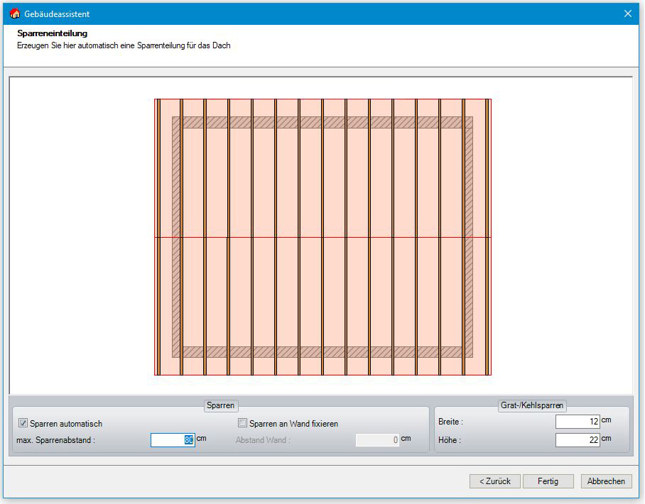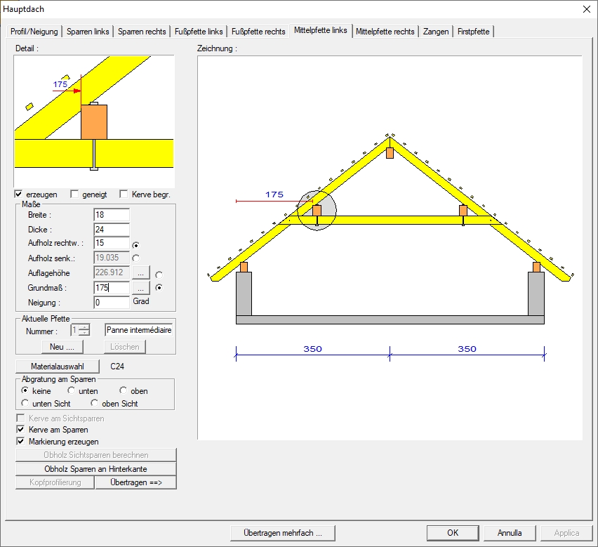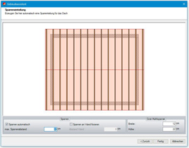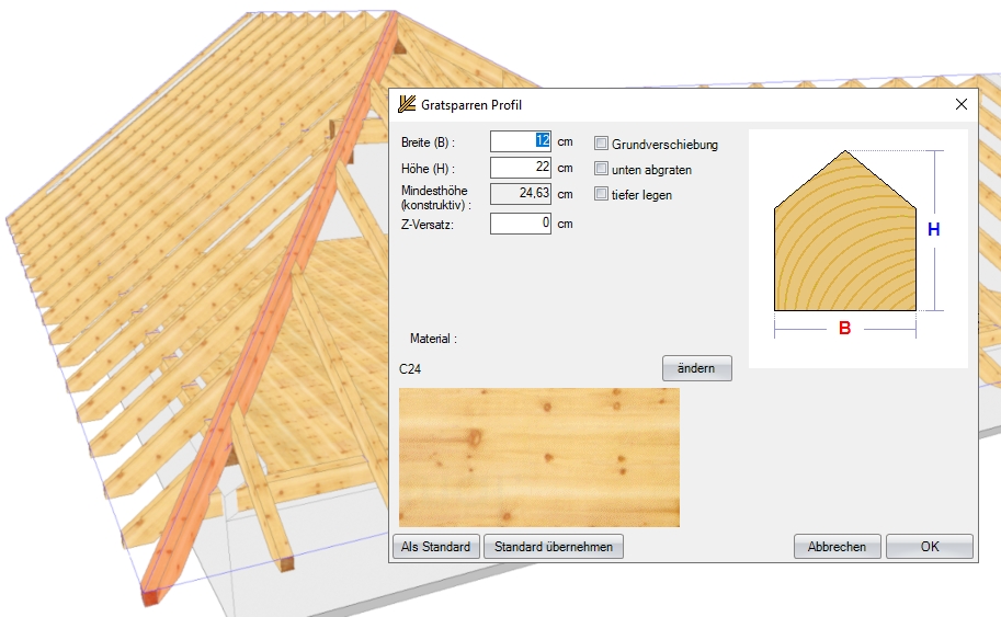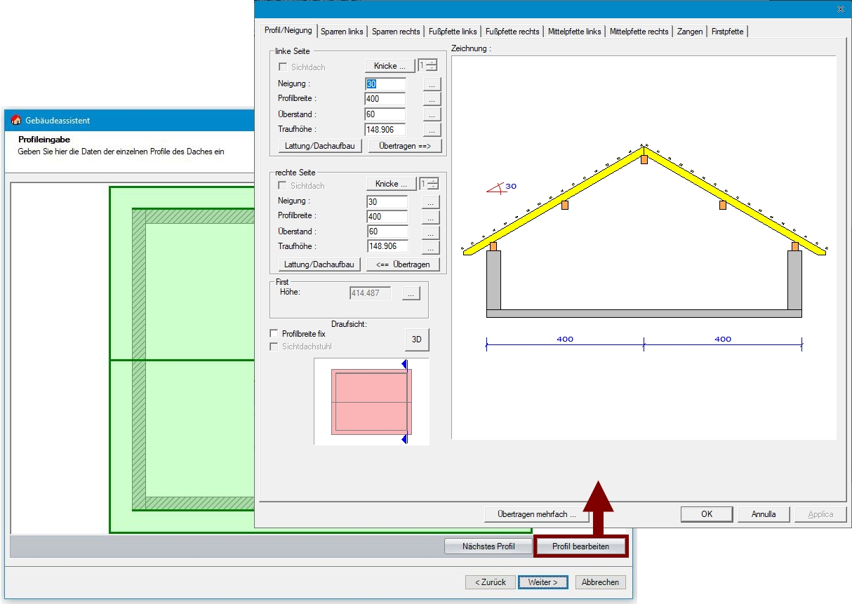 Sämtliche Profildaten wie z.B. Dachneigung, Auflagehöhe und Querschnitte können über den Schalter Profil ändern verändert oder im Nachhinein editiert werden. Die im Dach enthaltenen Bauteile wie etwa Sparren, Fußpfetten, Mittelpfetten, Grat- und Kehlsparren werden automatisch erstellt.