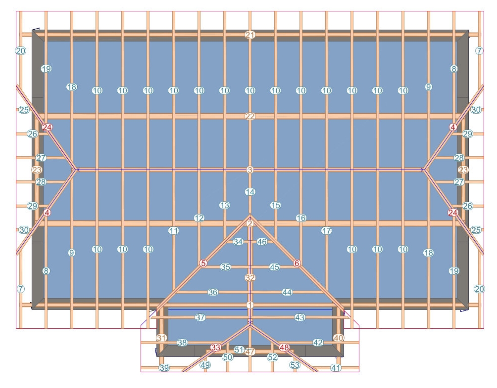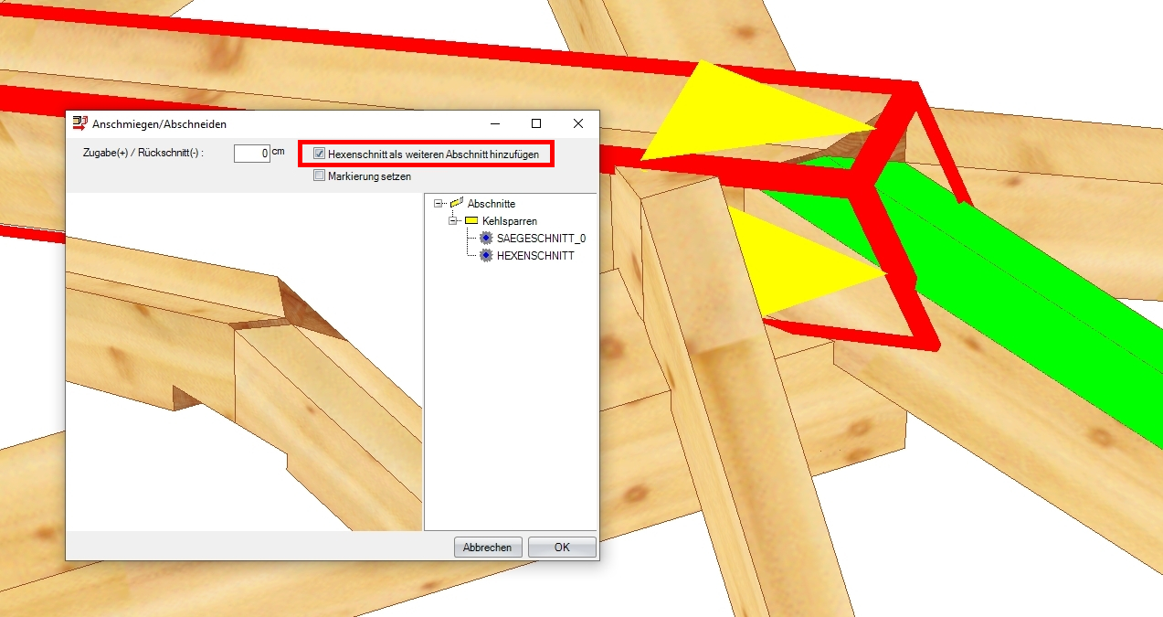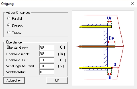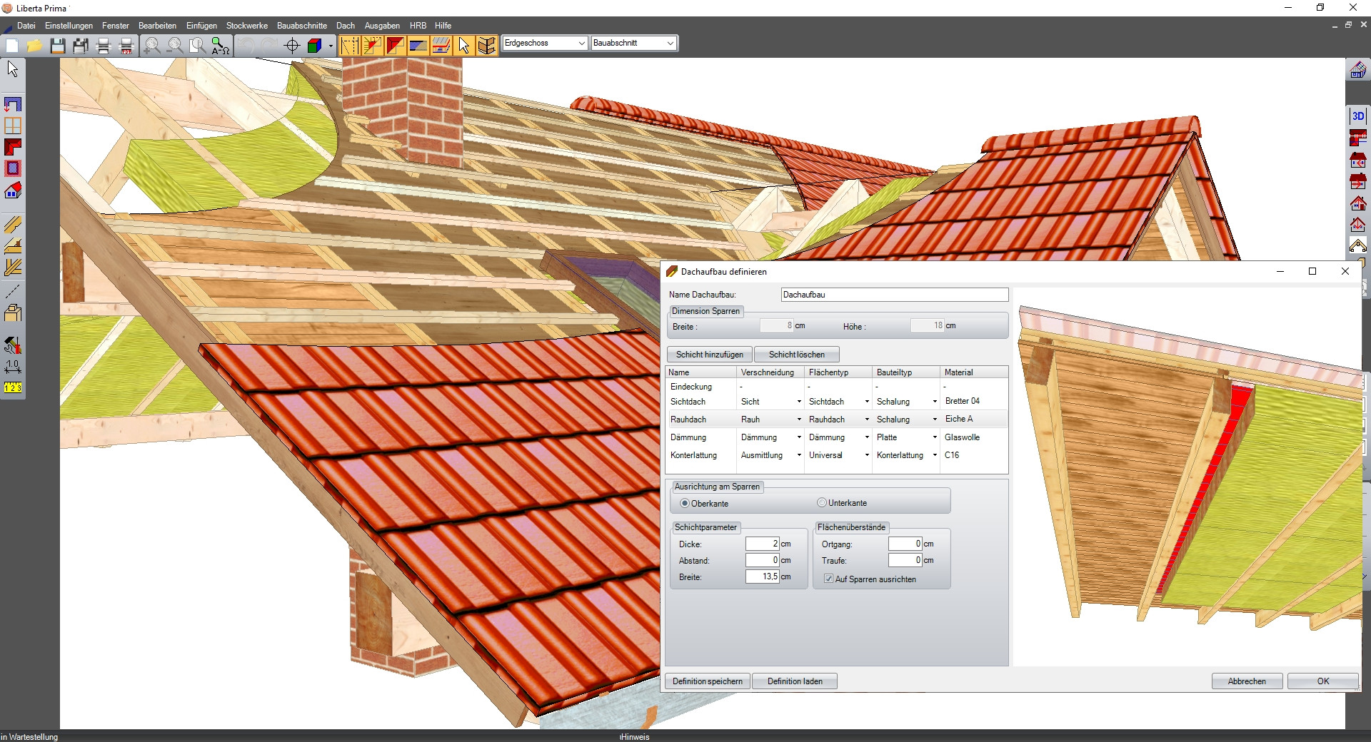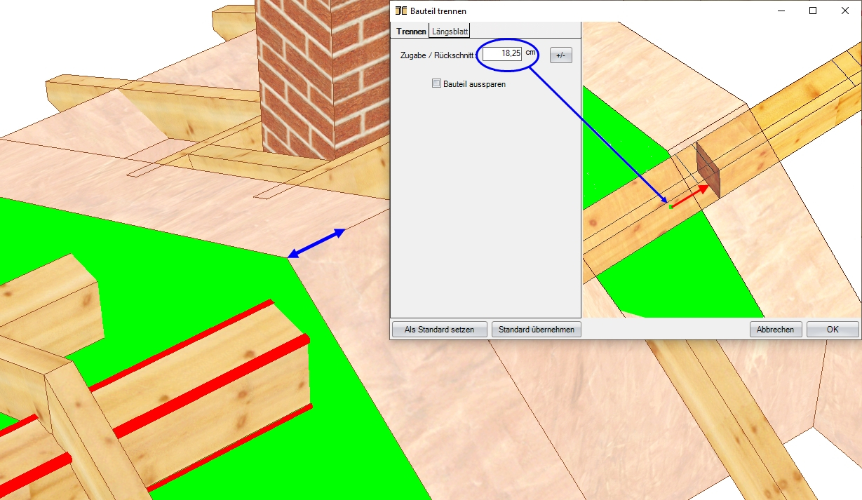 Sämtliche Profildaten wie z.B. Dachneigung, Auflagehöhe und Querschnitte können über den Schalter Profil ändern verändert oder im Nachhinein editiert werden. Die im Dach enthaltenen Bauteile wie etwa Sparren, Fußpfetten, Mittelpfetten, Grat- und Kehlsparren werden automatisch erstellt.