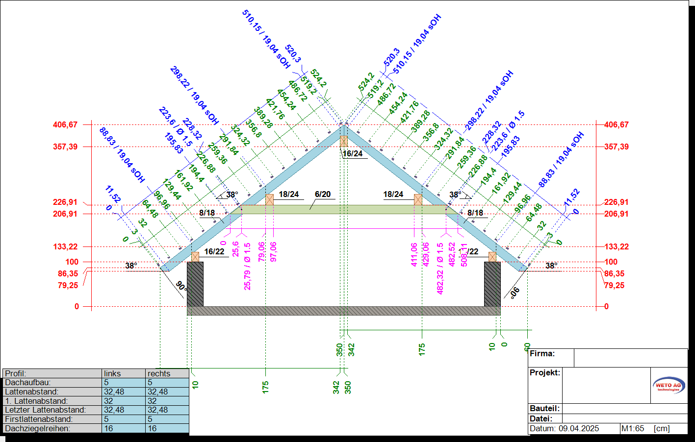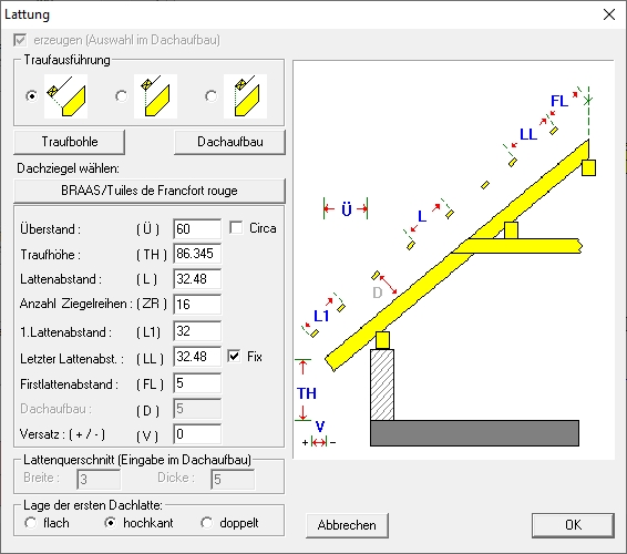 Durch Klicken auf die Schaltfläche Profilzeichnung erzeugen öffnet sich die vollständig vermaßte Zeichnung des gewählten Dachprofils.