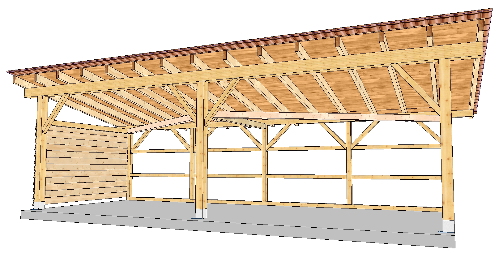 Planung und Fertigung von Dachstühlen, Carports, Pergolas, Holzterrassen mit Überdachung, freie Konstruktionen in Holz, Fachwerkwände (Tragkonstruktionen), Hallenbau, Wände mit Elementierungen.